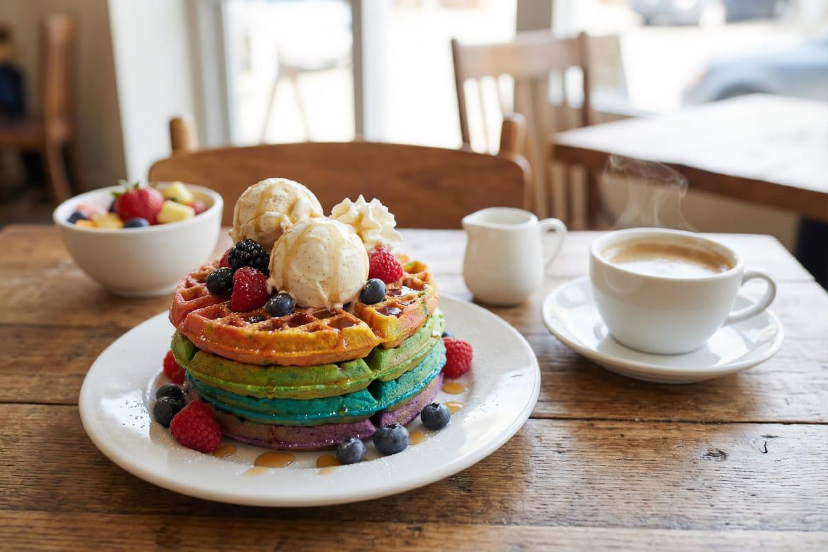 Ett klassiskt tillbehör till regnbågsvåfflor är vaniljglass. Dess ljusa färg kontrasterar utmärkt mot smetens starka färger. En eller två kulor glass räcker för att desserten ska se effektfull ut och smaka fantastiskt.
