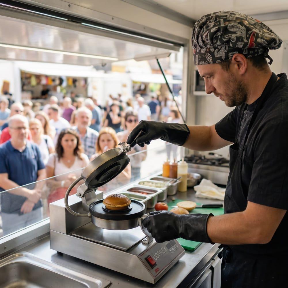 Apparaten möjliggör tillagning av både klassiska köttburgare med grönsaker och såser, samt lätta vegetariska burgare eller söta dessertversioner. Dessertvarianten med glass och frukt blir alltmer populär på kaféer och glassbarer, eftersom den utgör ett originellt alternativ till traditionella sötsaker. Det breda användningsområdet gör att apparaten kan användas hela dagen i olika menykonfigurationer.