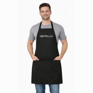 De två fickorna på framsidan av förklädet har en specifik praktisk användning. Kockar och kökspersonal kan förvara en kökstermometer, anteckningsblock, penna eller en handduk där. Tillgång till fickorna utan att ta av förklädet påskyndar arbetet och förbättrar dess organisering. Framfickor är säkrare än sidofickor eftersom innehållet inte faller ut vid rörelser eller när man böjer sig ner.