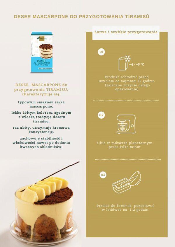 Mascarponekrämen är perfekt som bas för tiramisu samt andra desserter som krämer, mousse eller tårtor. Dess unika smak och konsistens möjliggör skapandet av desserter med hög estetisk och smakmässig kvalitet.